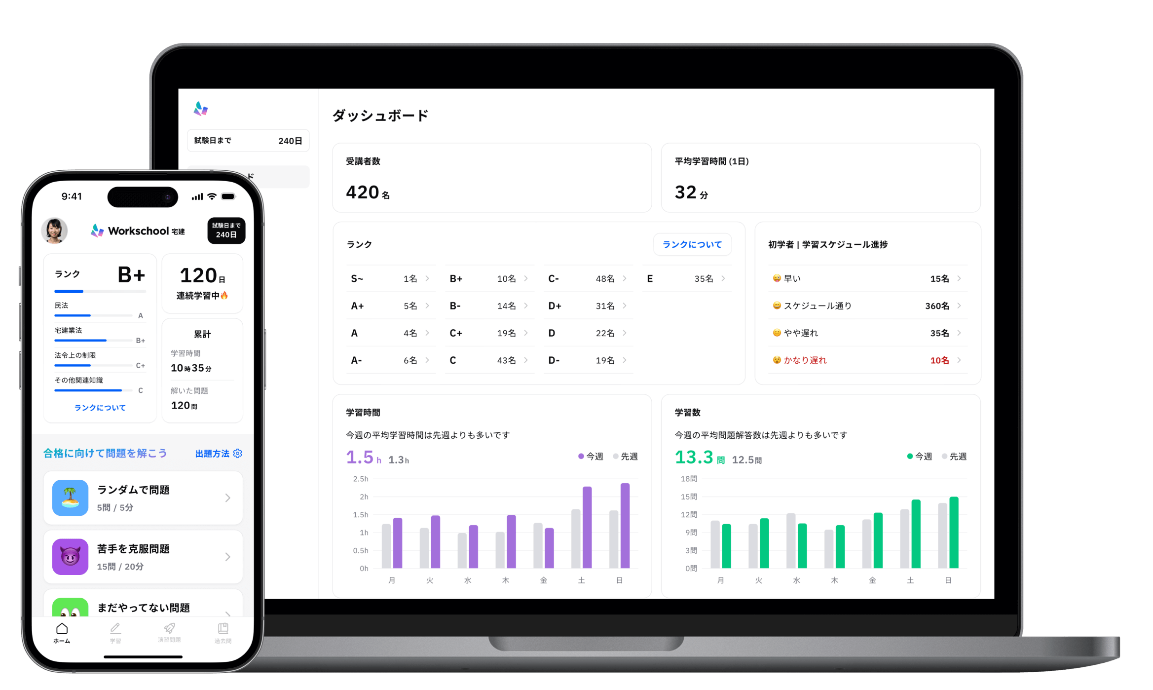 スキマ時間でスマホでできるから、効率的な学習が促せる。法人向け宅建学習アプリなら、Workschool 宅建。